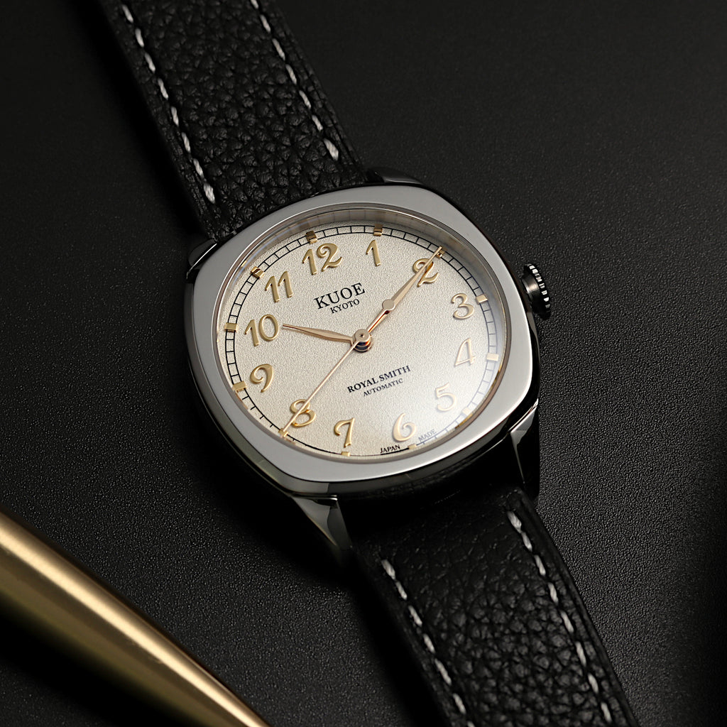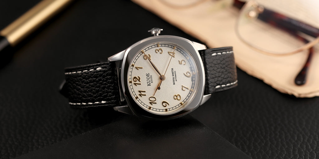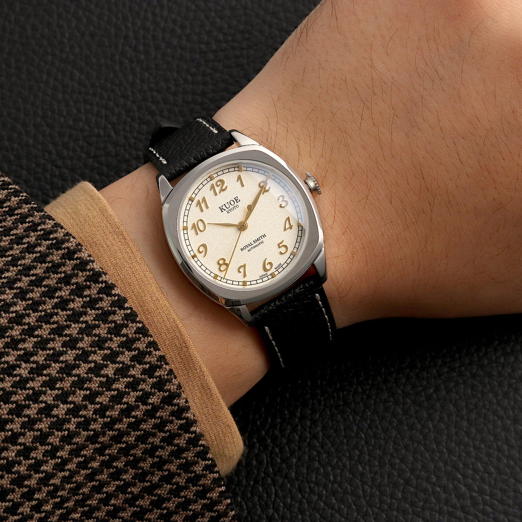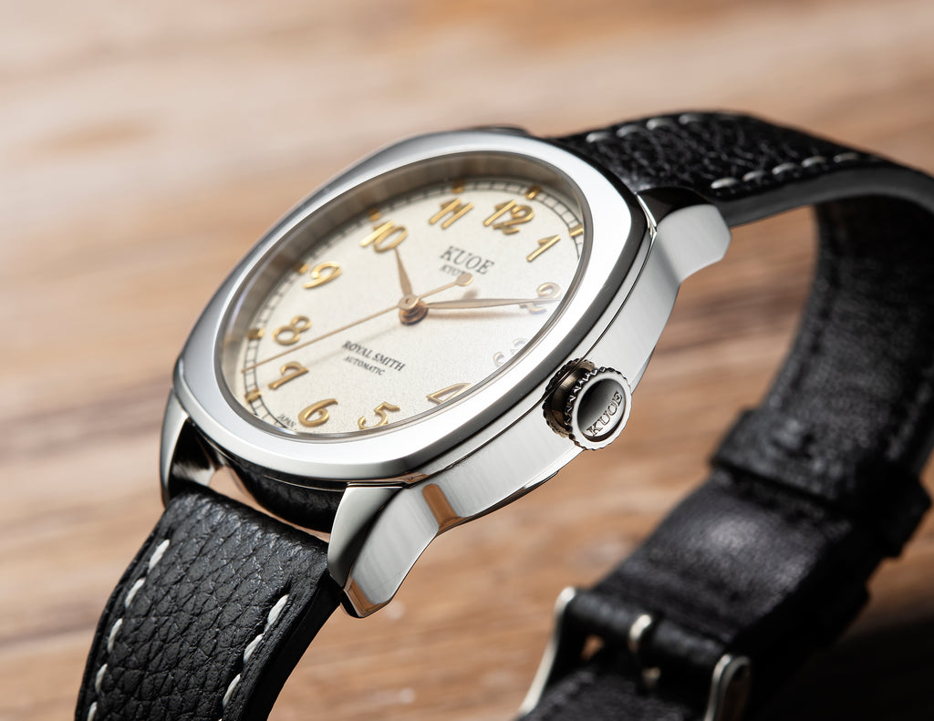 Designed from scratch with thoroughly selected parts. Inspired by antique watches from the 1940's, this model uses a cushion case that was common in those days.