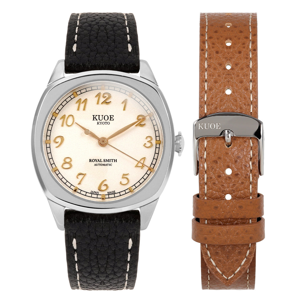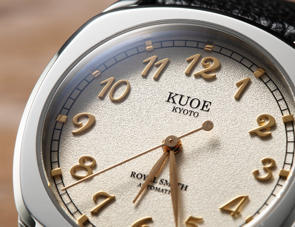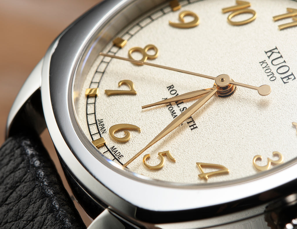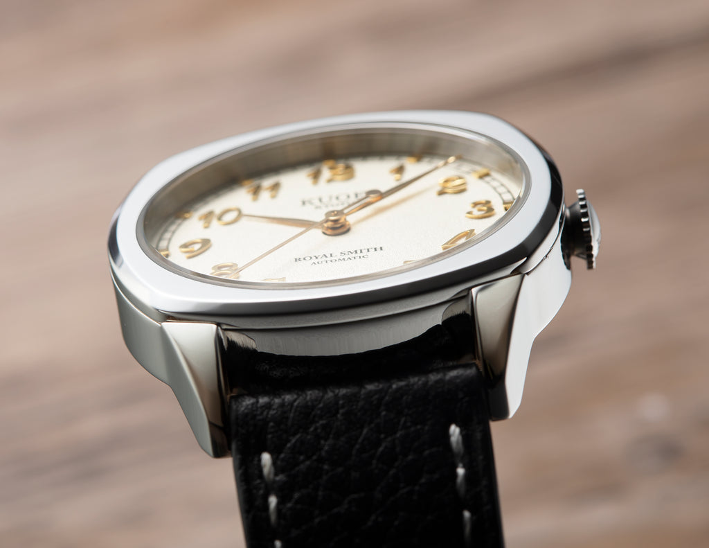 Designed from scratch with thoroughly selected parts. Inspired by antique watches from the 1940's, this model uses a cushion case that was common in those days.